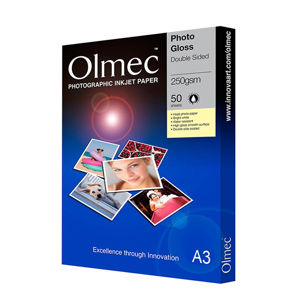 Olmec Photo Glossy 250gsm Double Sided (OLM65) A fade resistant microporous mid-weight double side coated RC base paper which gives a true photographic look and feel. This is a high gloss, high white paper with a smooth finish which has been developed specifically for generating photographic quality prints or enlargements of your favourite images.